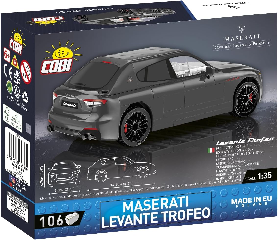 The Maserati Levante Trofeo is a version of the SUV Levante with a powerful 590 hp V8 engine that accelerates from 0 to 100 km/h in 3.9 seconds and reaches a top speed of over 300 km/h! Maserati Levante Trofeo is undoubtedly the best version of the Levante and at the same time is a full-blooded, thoroughbred of an SUV. It combines the best features of the Italian brand, unconventional elegance and the performance worthy of a Maserati sports car. The model is made of COBI construction blocks in 1:35 scale, produced under the license of the famous Italian automotive brand Maserati. It is an ideal product for both children and adult automotive fans. Thanks to specially designed blocks that faithfully reflect the shapes of the body and durable, colorful prints, the vehicles created by COBI look like small works of art. This block model is also ideal for display in the collection of an adult automotive fan. Thanks to the solid construction and movable wheels on special rubber tires it’s also perfect as a toy for kids of all ages.