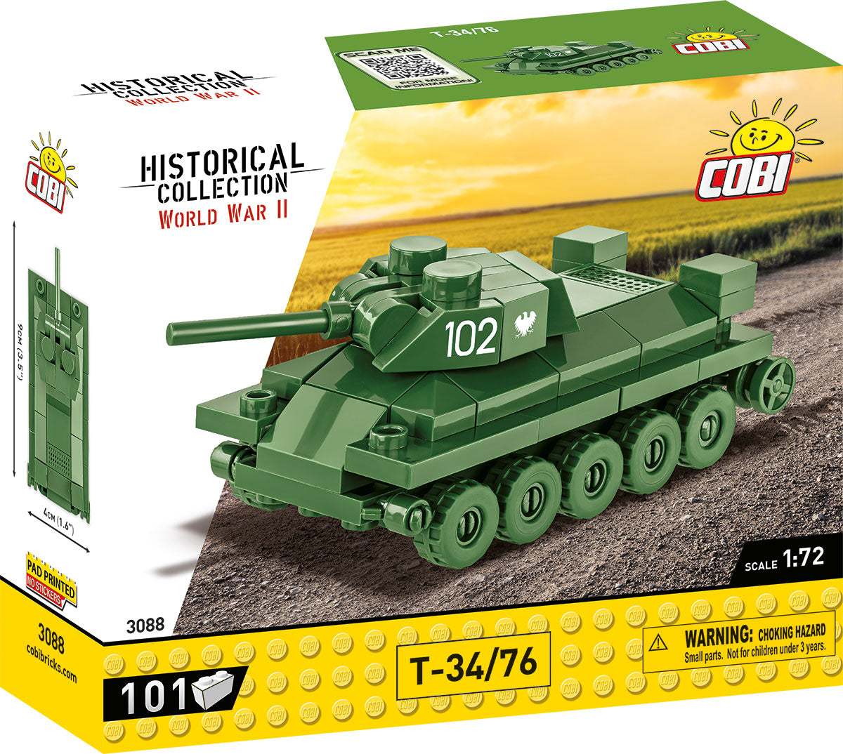 The T-34/76 is a basic medium tank that has been the backbone of the Soviet tank forces since 1941. Due to its great simplicity it was very easy to produce, use and repair. It was characterized by very good armor, weapons and mobility. Many historians believe that the T-34 tank contributed significantly to the victory of the Allied countries in World War II. The mini-model made of COBI construction blocks was designed in a scale of 1:72 and consists of 101 high-quality elements. When built the tank is 9cm long. Despite its compact size the model retains all the most important features of its historical inspiration! On the sides of the turret there are prints with the markings of the Polish Army in the East and the number 102. The tank can be moved thanks to movable wheels. The tank's turret is also movable and can be rotated. The model is a perfect start to your adventure with COBI construction blocks. The T-34/76 is also an interesting model and gift for collectors. It takes up little space and can easily find its place on a desk at home, at work or on a bookshelf. If you are an advanced block designer, the model will also provide you with very interesting elements to create whatever you can imagine. Express your passion through blocks and build history, piece by piece!