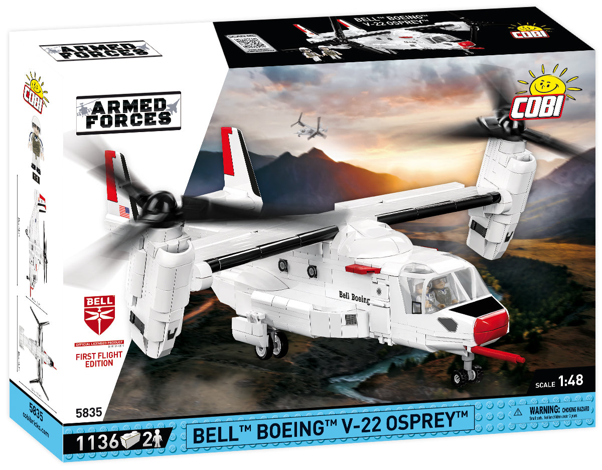 The COBI model of the Bell-Boeing V-22 Osprey was released under the license of the American manufacturer of combat helicopters, Bell Helicopter Textron. Developed in 1:48 scale and consists of 1090 elements; including two figures depicting the first test pilots in distinctive uniforms.