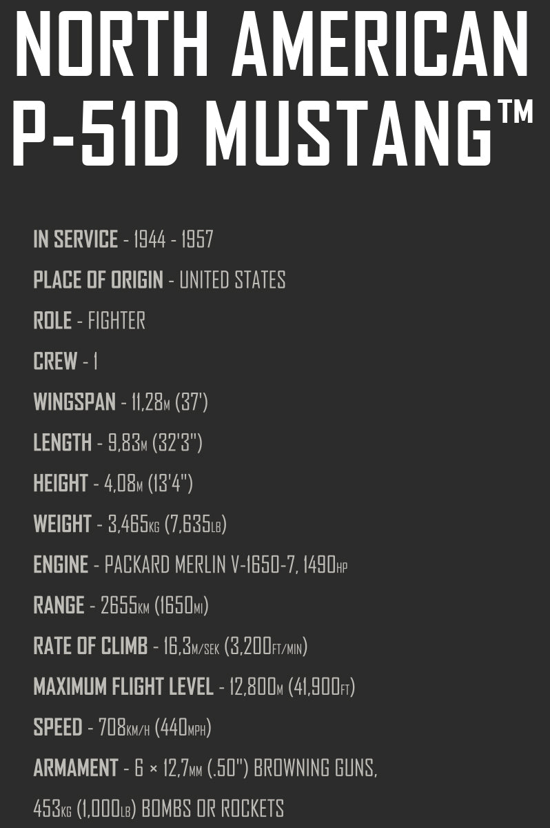 The Mustang P-51D is a building-block model from the film released under the original TOP GUN: Maverick™ license. The main character of the film, Maverick, prides himself on flying this historic aircraft. You can now build your own Mustang on a model scale of 1:32. The set has been faithfully reproduced from 350 COBI building blocks. In the set you will find high-quality prints accurately reproducing the original painting of the film aircraft. The model is equipped with rotating propellers, lockable chassis, movable wheels and an opening canopy, where you can place our special figure inspired by the main character of the film. It also includes an elegant block display stand and a plaque containing the name of the aircraft and the film logo. This exclusive licensed kit is certainly a great gift idea for builders of all ages who are movie fans, both of aviation and military movies. It looks perfect in an elegant office or in a teenager's bedroom. The North American P-51 Mustang was an American single-engine fighter during World War II. It was produced at North American Aviation's US plants. It was successfully used in the U.S. Air Force and by its allies during The Second World War and during the Korean War. The very successful design of the 1940s meant the aircraft stayed in service with one or more countries until 1984! Over a period of 46 years over 15,000 Mustangs were manufactured. Today, many of these aircraft are in private hands, including our fictional hero Maverick! Mustangs are still used at air shows and in flight competitions to this day.