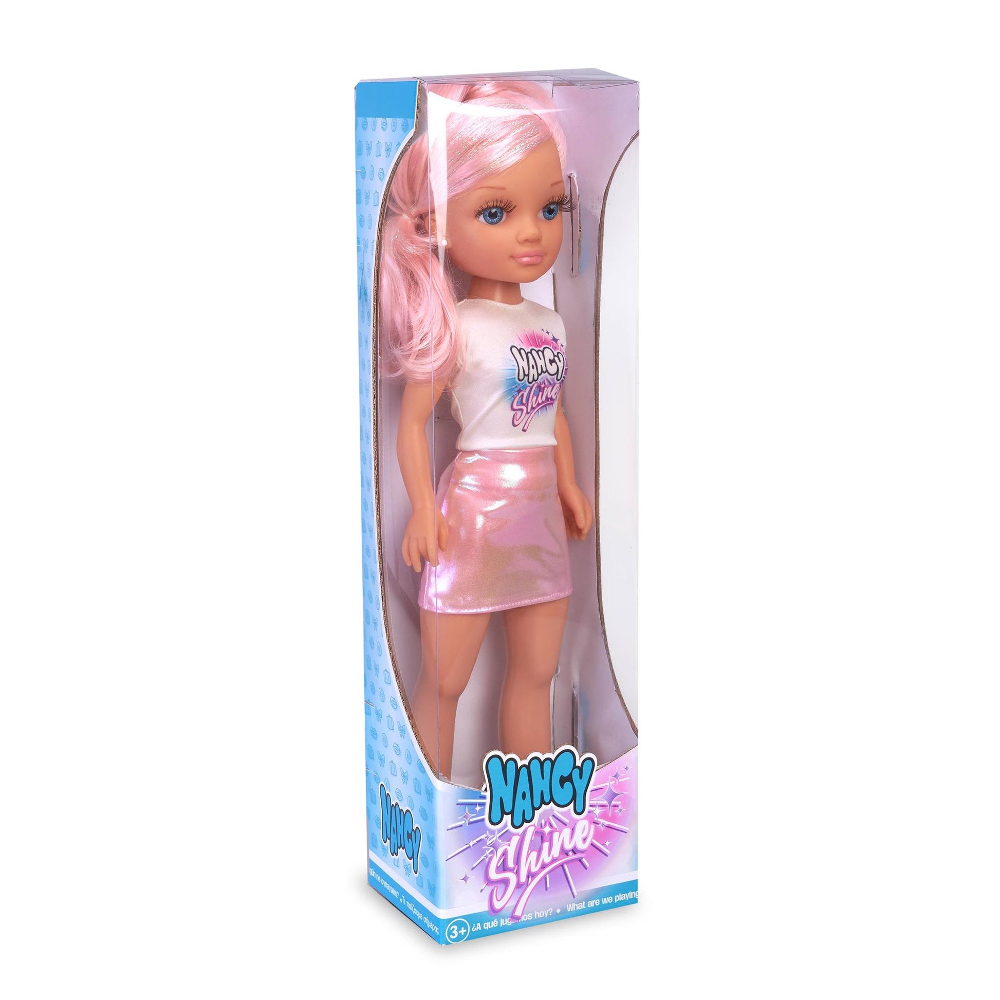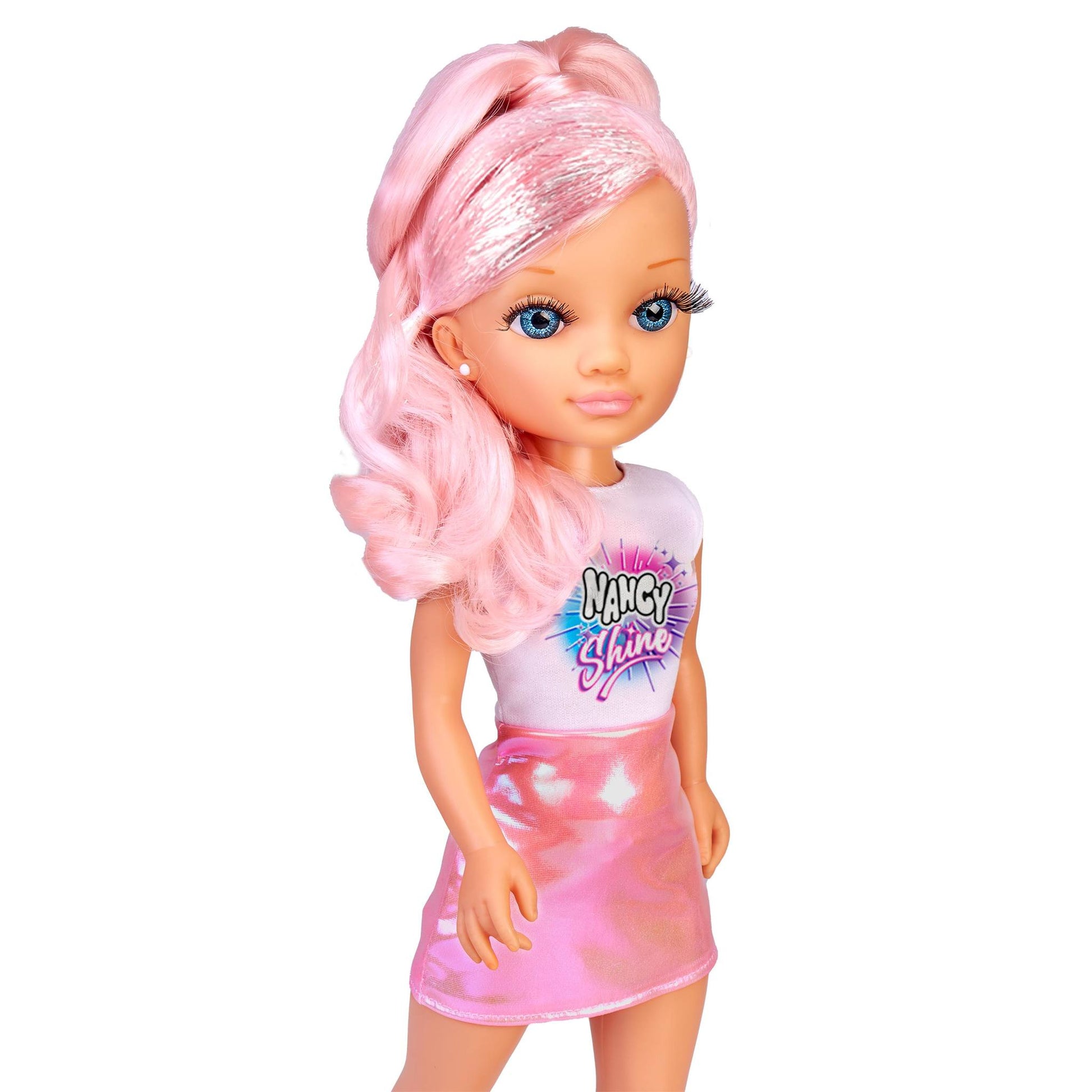 Discover a world of sparkle and color with Nancy Shine. Her metallic one piece dress matches her long, wavy hair highlighted with metallic streaks and pulled back in a high ponytail. Up to three different colors: pink, blue and purple.