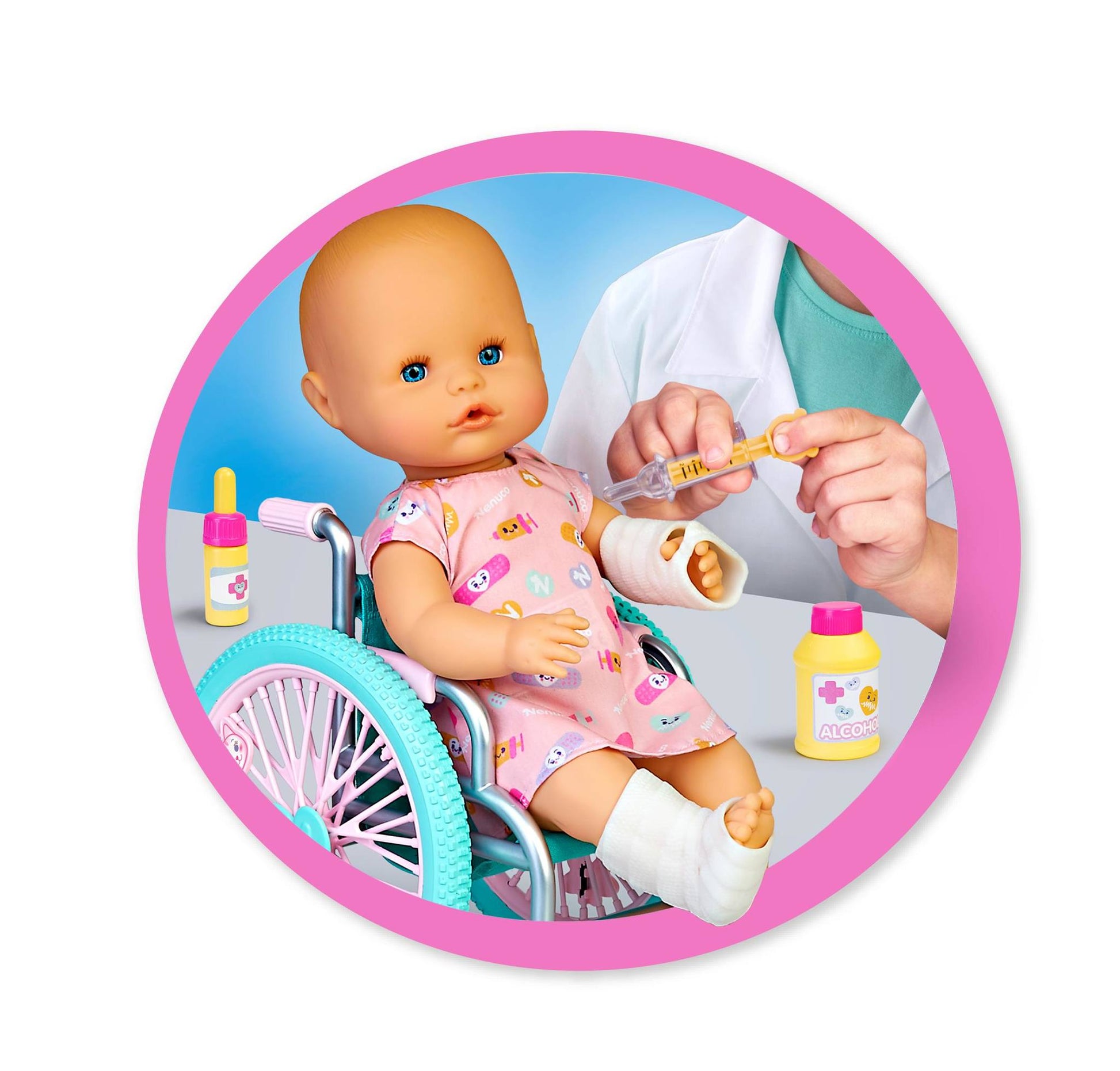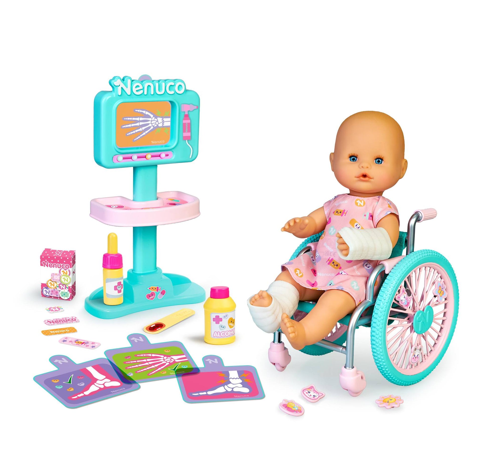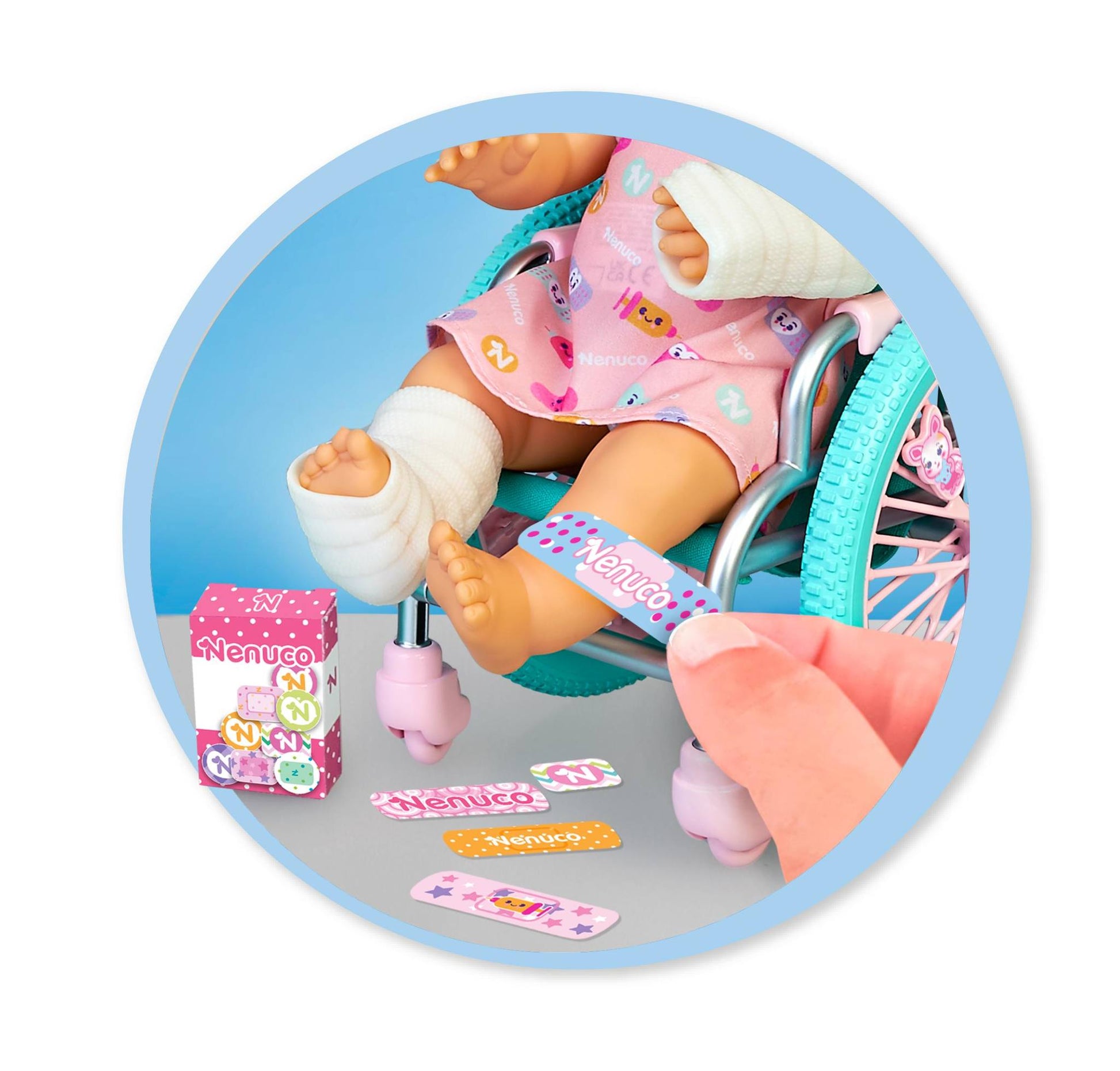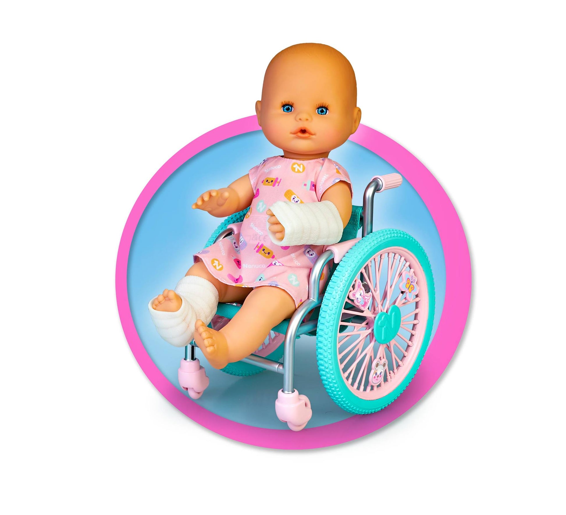 - Nenuco comes ready for her visit in a pink patterned hospital gown with a foot cast and arm cast in her blue and pink wheelchair.